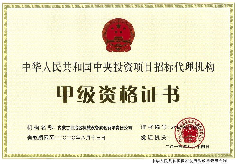 中央投資項目招標(biāo)代理機(jī)構(gòu)甲級資格證書